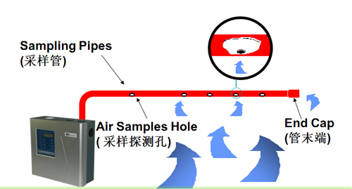 吸氣式感煙火災探測器跟傳統的(點型)煙霧探測器有所不同??諝獠蓸酉到y由在天花板上方或下方每隔幾米平行安裝的管道組成。在每根管子的上面,每隔幾米就鉆有一個小孔,這些小孔很均勻的在天花板上分布,這樣就形成了一組矩陣型的空氣采樣孔。利用探測主機內部抽氣泵所產生的吸力,空氣樣品或煙霧通過這些小孔被吸入管道中并傳送到達探測主機內部的高靈敏度煙霧探測腔檢測空氣樣品中的煙霧顆粒濃度,可實現未現火苗時提前報警,以達到在損失未發生時就已扼殺在搖籃中。