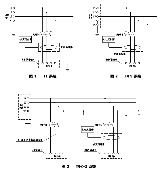 3.4.4TN-C-S接地系統中,電氣火災監控系統的剩余電流動作保護只允許使用在PE線與N線分開以后的部分。